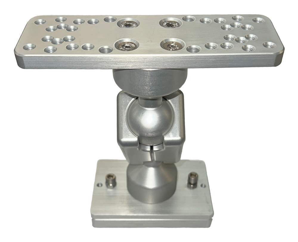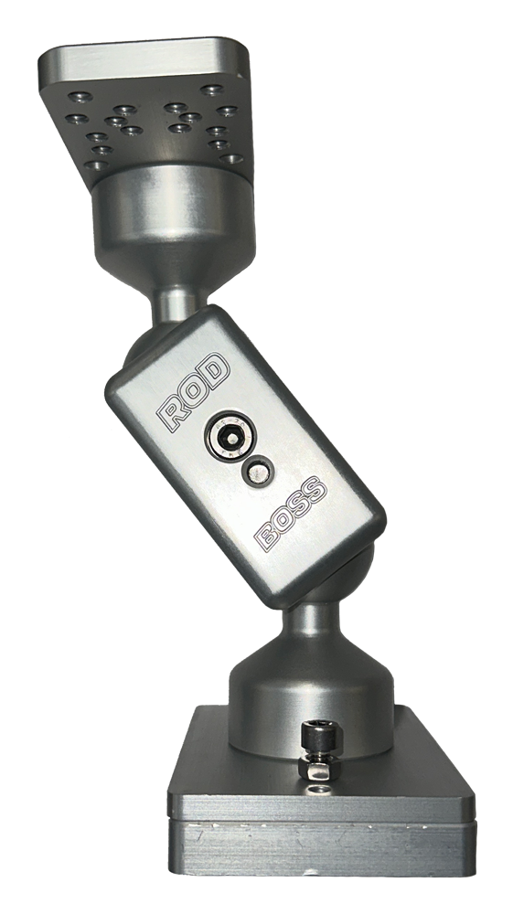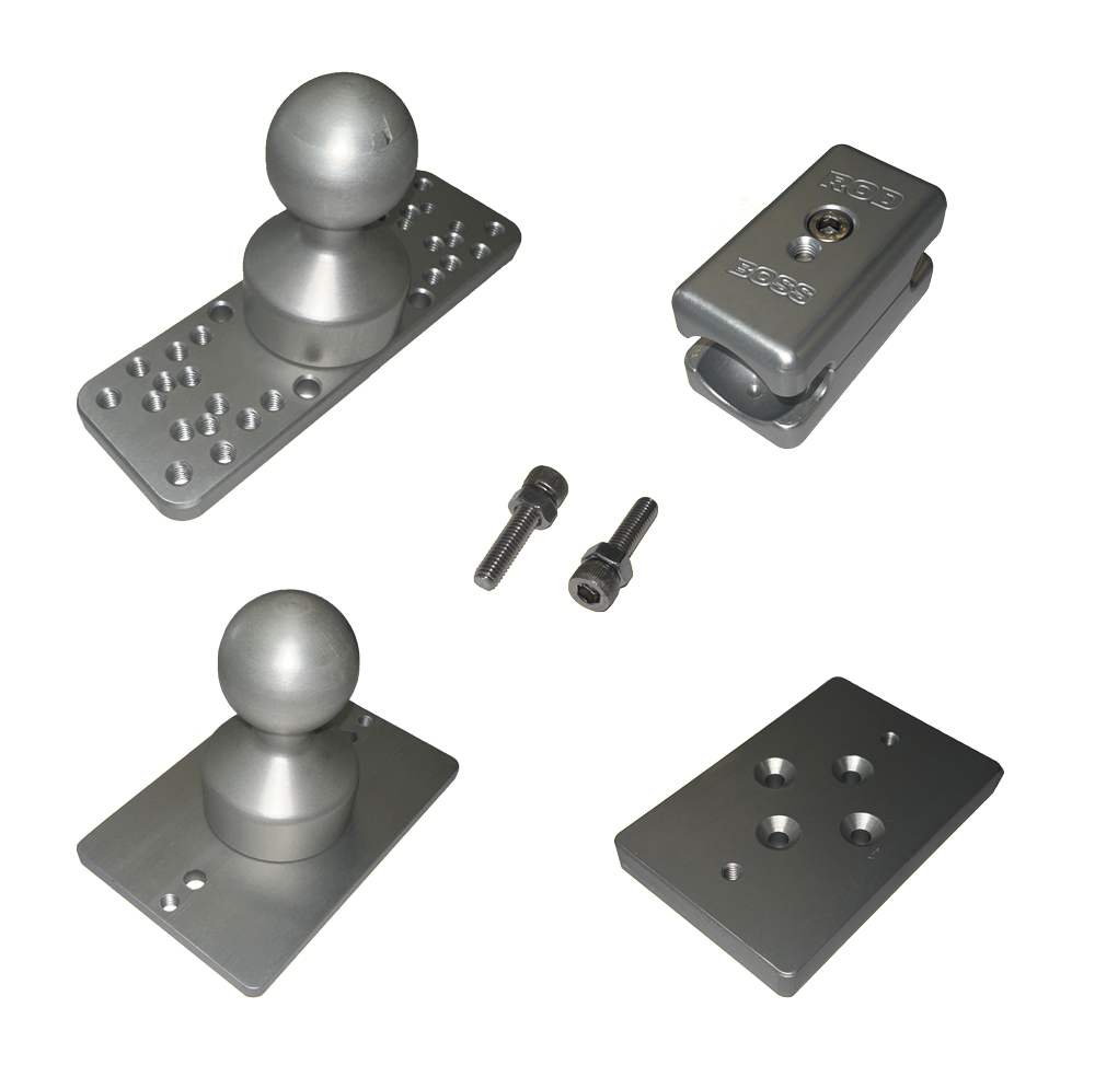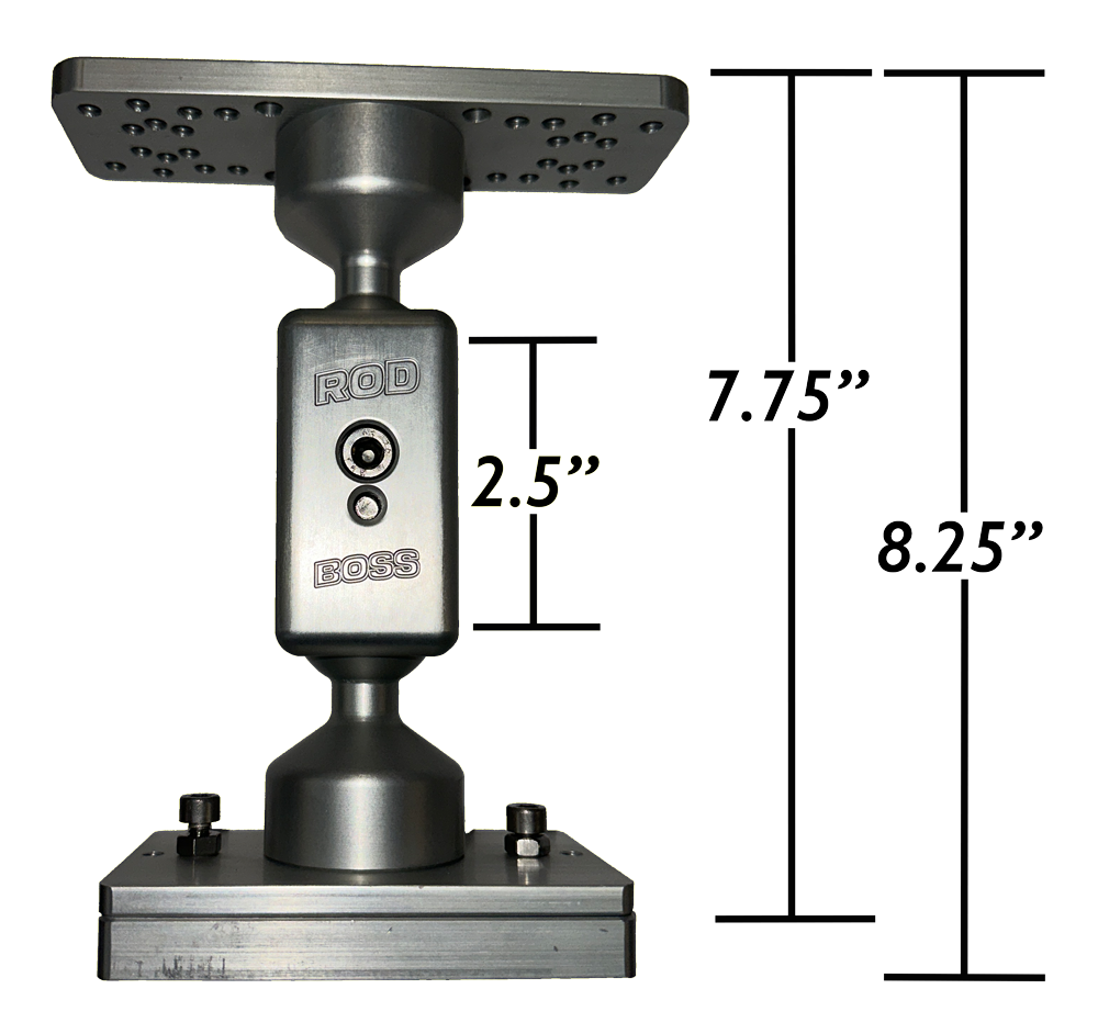 Made of anodized aluminum and proudly manufactured in the United States, the Rod Boss electronics mounts are extremely durable and strong.  Set your favorite fish finder screen where you want it, secure the hex head cap screws and it won't move again unless you want it to.  Hole pattern in the top of the mount fits most if not all popular fish finder gimbals.  Total height measures 8-1/4" and from center ball to center ball is 2-1/2".  Every mount includes a removable mounting plate to secure the base to any flat surface or remove the mounting plate and the included track plate will slide into most 3" tracks.  Track plate measures 4-1/2" x 3".