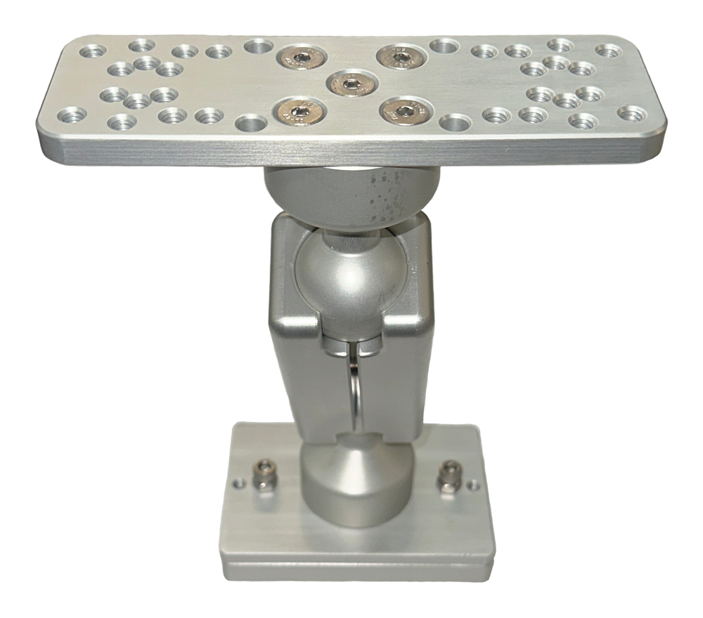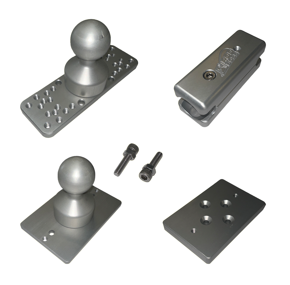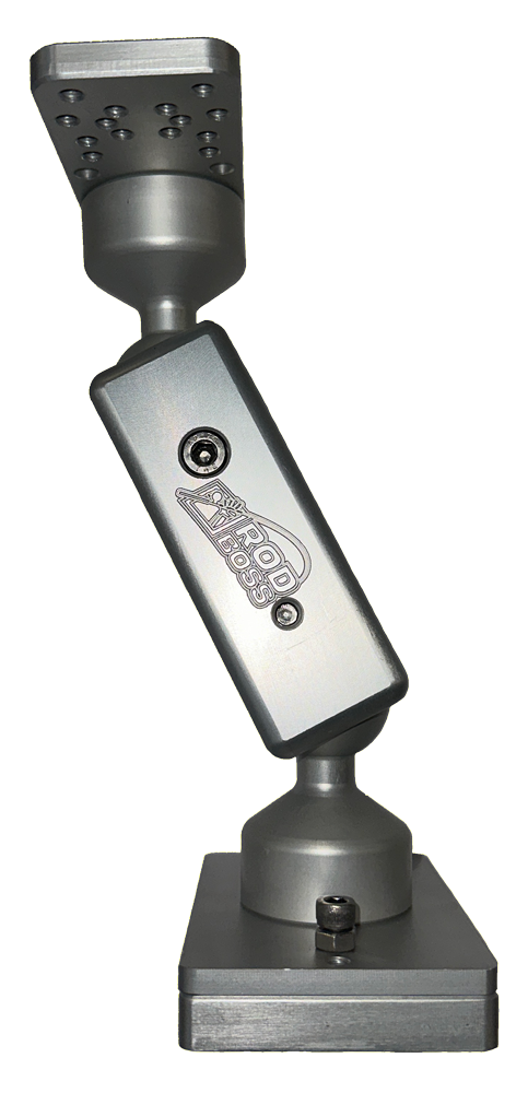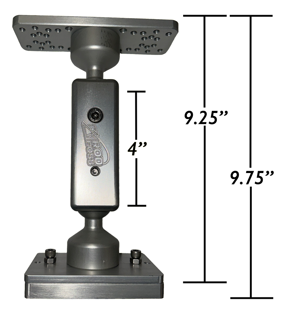 Made of anodized aluminum and proudly manufactured in the United States, the Rod Boss electronics mounts are extremely durable and strong.  Set your favorite fish finder screen where you want it, secure the hex head cap screws and it won't move again unless you want it to.  Hole pattern in the top of the mount fits most if not all popular fish finder gimbals.  Total height measures 9-3/4" and from center ball to center ball is 4".  Every mount includes a removable mounting plate to secure the base to any flat surface or remove the mounting plate and the included track plate will slide into most 3" tracks.  Track plate measures 4-1/2" x 3".